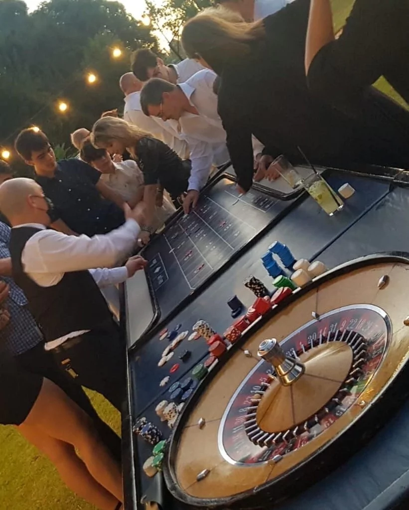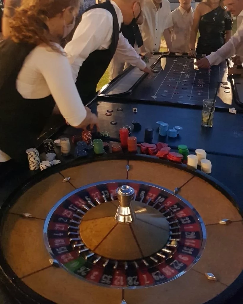Mesas iguales a las de un casino, con croupiers uniformados y show de subasta de premios con animación.
