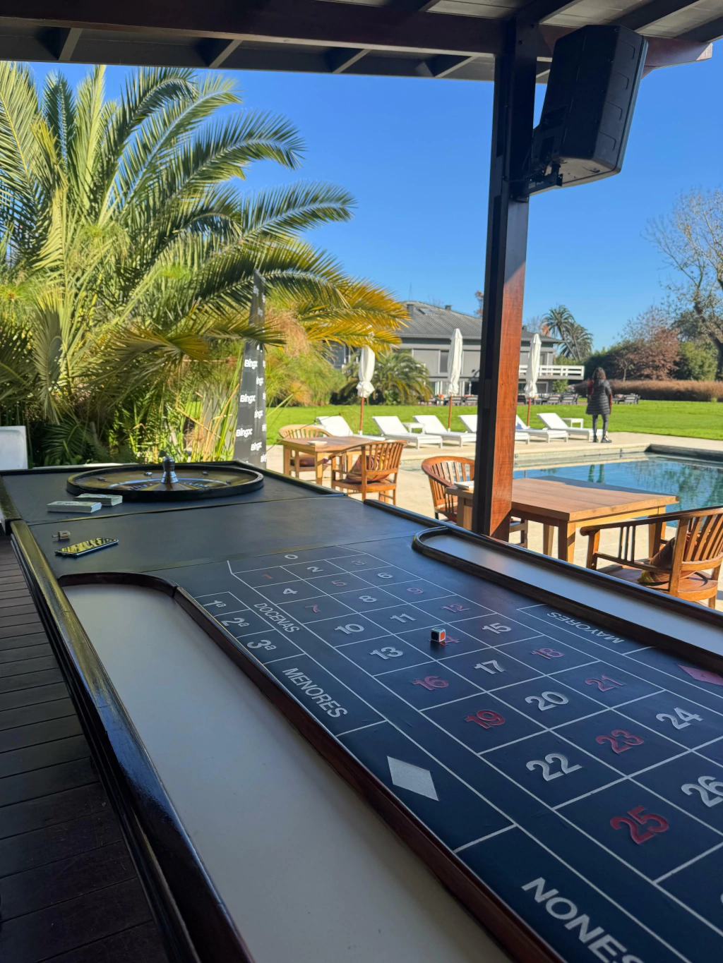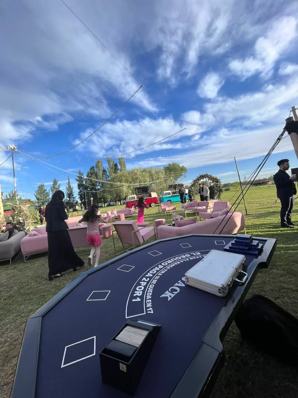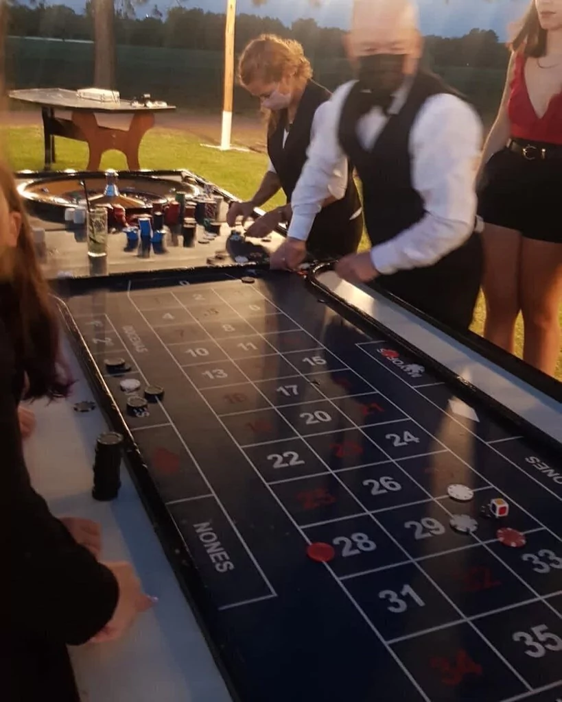 Mesa de ruleta + mesa de poker o punto y banca + mesa de black jack + tragamonedas + ambientación con banners y cartel backligth y un croupier para cada juego.